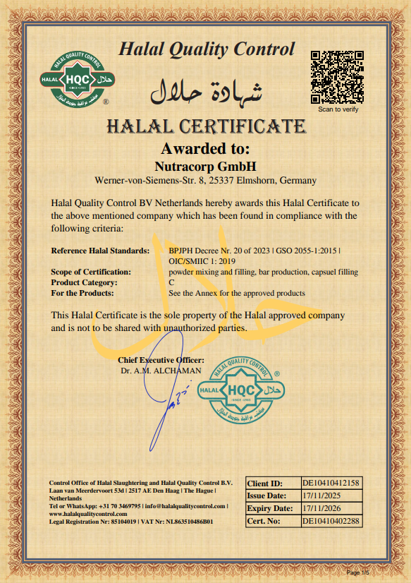 This halal certificate applies to the bioactive collagen peptides we purchase as described above.